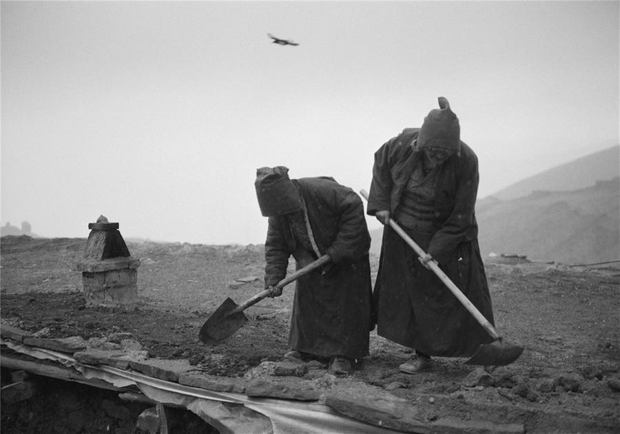 Nuns repair a roof. Photo was taken by Zhong Guohua in Qinghai province in 2016. [Photo provided by cpanet.org.cn] |