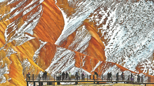 In the 1920s and '30s, a group of Chinese geologists studied the landform in Zhangye, before naming it "Danxia", or "the red afterglow", indicating the landscape's dominant rusty red hue produced by iron oxide. The Zhangye National Geopark is home to the "Colorful Danxia", where red serves as the backdrop to a striking palette shaped by minerals — iron sulfide creating yellow hues and high concentrations of chloride and iron silicate producing shades of green and blue.