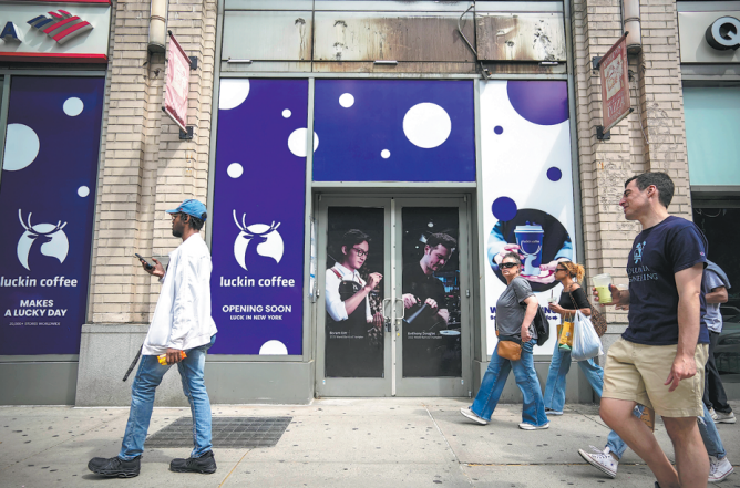 People walk past a Luckin Coffee store before its opening in Chelsea in New York on June 8. LEVINE-ROBERTS/IMAGO