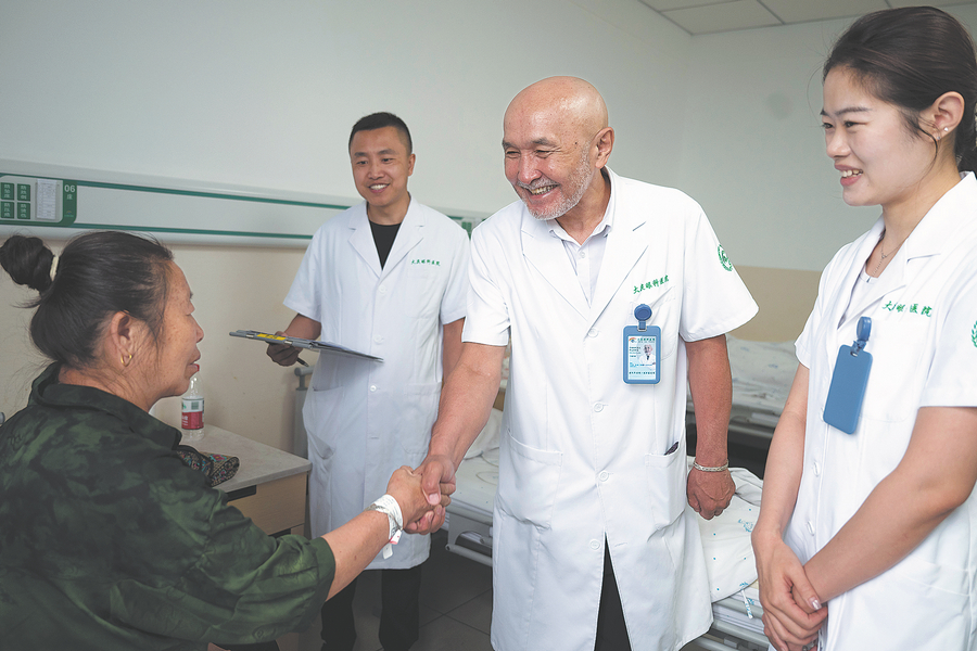 Saulebek Kabylbekov (second from the right) greets a patient at Daqing Ophthalmology Hospital in Daqing city, Northeast China's Heilongjiang province, July 17, 2025. ZHANG TAO/XINHUA