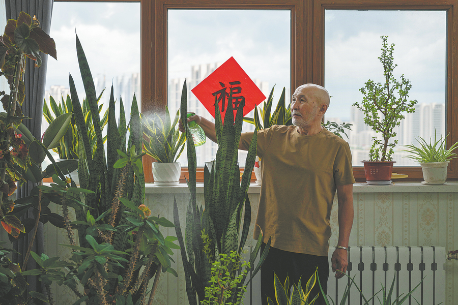 Saulebek Kabylbekov waters green plants at his apartment in Daqing city, Northeast China's Heilongjiang province, July 16, 2025. ZHANG TAO/XINHUA