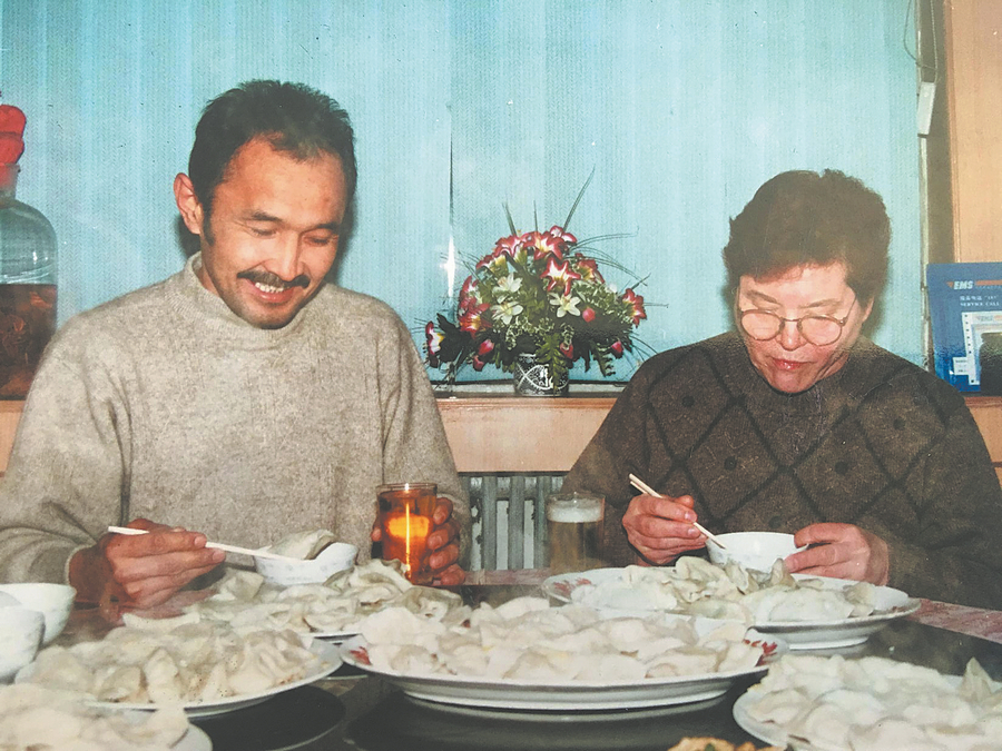 Saulebek Kabylbekov (left) eats dumplings with a companion when celebrating the Spring Festival in China in 2002. XINHUA