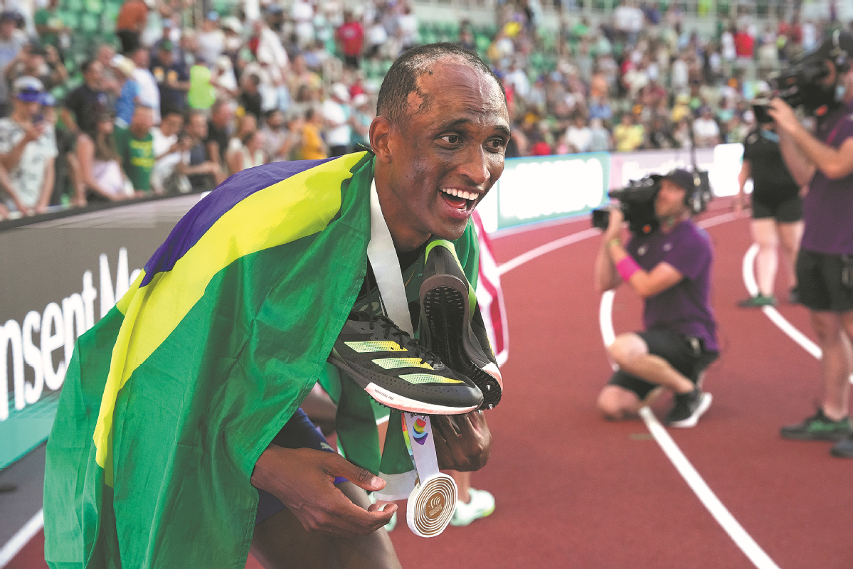 Alison dos Santos, of Brazil, celebrates after winning the gold medal in the men's 400m hurdles final at the 2022 World Athletics Championships in Eugene, Oregon. A burn victim as a child, the Brazilian hurdler is thankful that track gave him a new life as a teen, when he was vulnerable and insecure about his scars. AP