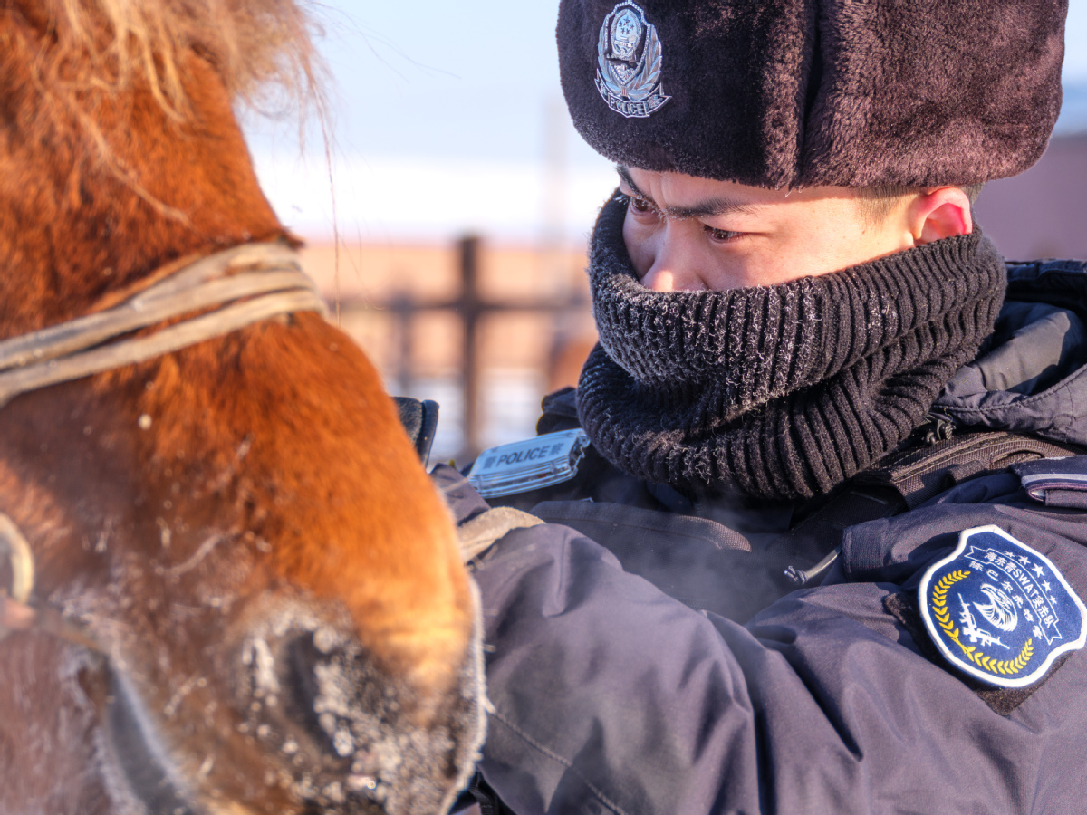 A policeman of the "Gyrfalcon" mounted police team wipes off the frost on a horse in Chenbarhu Banner of Hulun Buir, North China's Inner Mongolia autonomous region, Dec 2, 2025. [Photo/Xinhua]