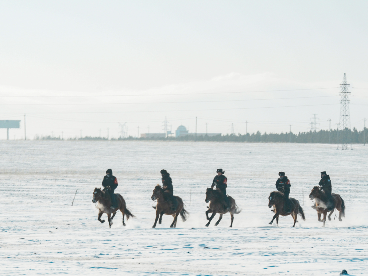 Policemen of the "Gyrfalcon" mounted police team conduct training activities on snow-covered Chenbarhu Banner Grassland in Hulun Buir, North China's Inner Mongolia autonomous region, Dec 2, 2025. [Photo/Xinhua]