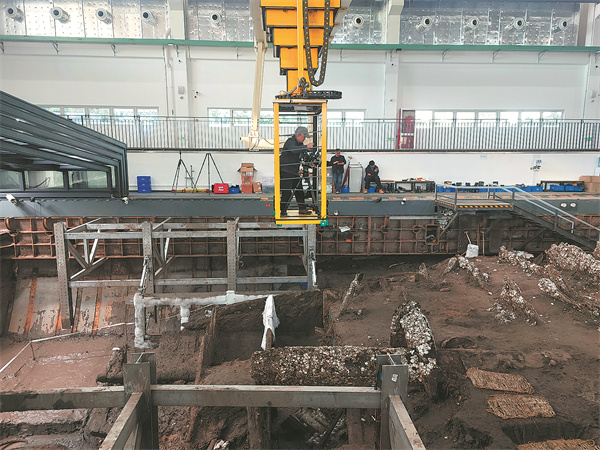The salvaged boat is placed in a former dock in Shanghai for further research.[Photo provided to China Daily]