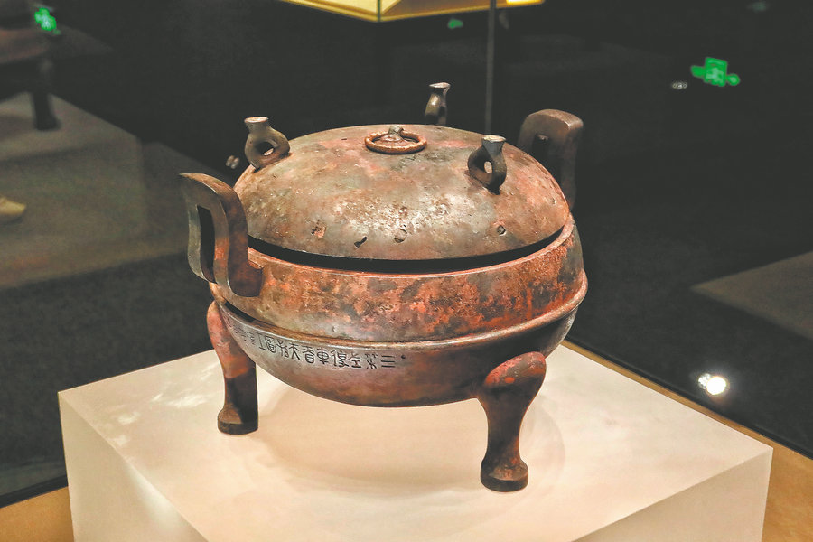 One highlight of the exhibition is a colossal three-legged huo ding vessel used for royal banquets and sacrificial ceremonies. Nearly 1 meter tall with an 88-centimeter rim, it is the largest Chu-era ding vessel ever excavated.