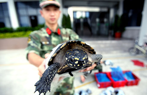 An officer holds one of the smuggled turtles in Shenzhen, South China's Guangdong province on Sept 20, 2015. [Photo/CFP] |
