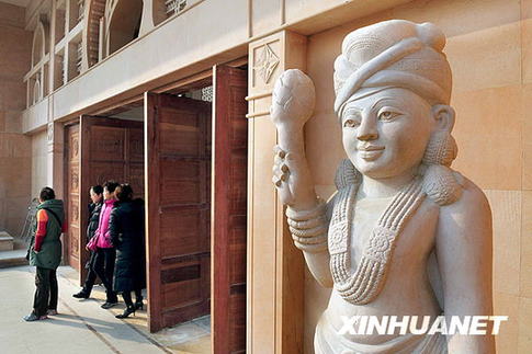 12月18日,幾位游客走出洛陽白馬寺印度佛殿正門。近日,位于洛陽白馬寺內(nèi)的印度佛殿對游人試開放。佛殿建筑面積達(dá)3450平方米,建筑方案、建設(shè)資金以及佛殿內(nèi)所需的佛教用品,均由印方提供。佛殿于2006年4月動(dòng)工,經(jīng)過中印兩國工藝師們兩年多的建設(shè),目前,包括主殿、佛像、牌樓、環(huán)廊等主要建筑均已完工,達(dá)到了接待游客的要求。(新華社記者王頌攝)