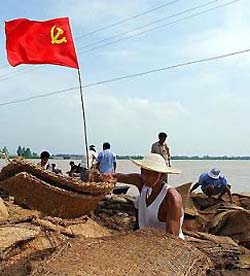 from river flooding near a flag of Chinese Communist Party, July 12, 2003