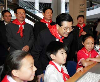 Early Monday, Hu was welcomed by jubilant children at the museum as he took a close look at about 600 pieces of state-of-the-art materials and products with children tagging along, including the return capsule used in China's first manned space flight, two robot "dogs" capable of performing on command, and environmental protection models.
