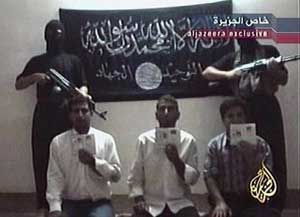 The Arab television station Al-Jazeera aired a video issued by the kidnappers, showing the three Turks kneeling on the ground in front of two black-clothed gunmen and a black banner emblazoned "Tawhid and Jihad," the name of al-Zarqawi's organization. The men held up Turkish passports.