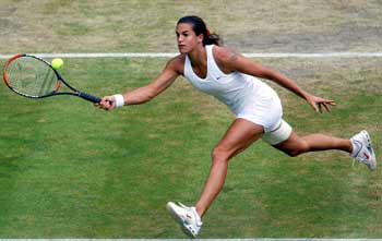 Fourth seed France's Amelie Mauresmo hits a forehand return to number one seed Serena Williams of the US in their semi-final match at the Wimbledon Tennis Championships in London, July 1, 2004. [Reuters]