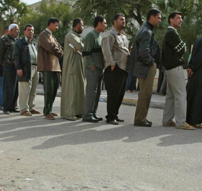 Iraqis queue at a school polling station in the At Maeel area of Basra, southern Iraq, January 30, 2005, as the country holds its first elections. Iraqi officials hope for a turnout of at least 50 percent to lend legitimacy to the outcome. Officials expect preliminary results in six to seven days and final results in about 10 days. [Reuters]