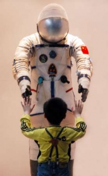 A Chinese boy tries to touch a space suit for China's