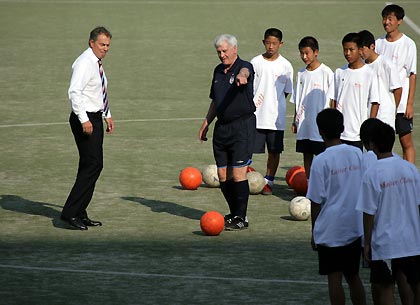 British Prime Minister Tony Blair (centre) kicks a football as former England manager Sir Bobby Robson (right) coaches