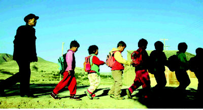 Zhengming (L) escorts his pupils on the hillside ally in the remote
