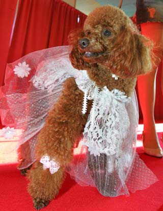 A miniature poodle clad in a lacy outfit walks a dog fashion show in Tokyo January 8, 2006. Some 25 dogs clad in fashionable outfits took part in the event. [Reuters]