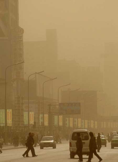 A sandstorm hits Hohhot, North China's Inner Mongolia Autonomous Region Thursday March 9, 2006. Sandstorms frequent the northern part of China in the spring. [Xinhua]