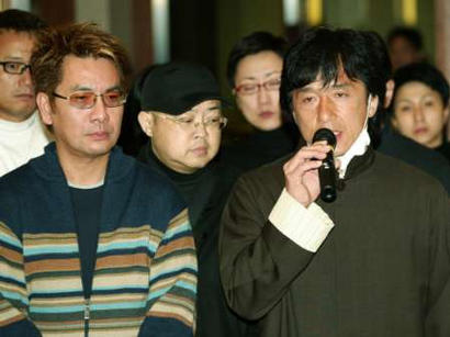 | Hong Kong movie star Jackie Chan (R) grieves over the death of canto-pop diva and actress Anita Mui, during a news conference held by Mui's friends at a hospital in Hong Kong, December 30, 2003. Hong Kong pop star Anita Mui, 40, well known in Chinese communities the world over, died on Tuesday less than four months after revealing that she had cervical cancer. [Reuters] |