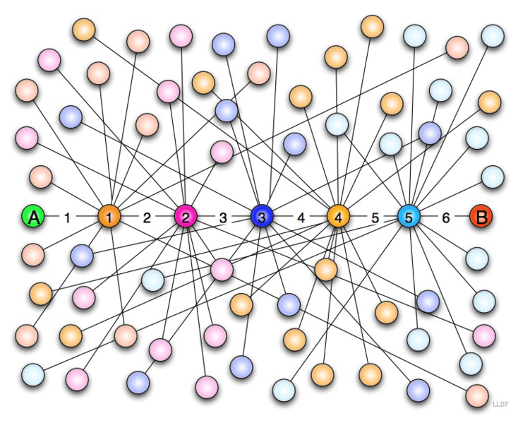 我們可以舉例來解釋“六度分離”理論:A和B曾在舞會上共舞一曲,B曾是C的室友,C又從D那借過一輛自行車,以此類推,最終第一個人A就和最后一個人以這種方式聯(lián)系到了一起。也就是說,通過個人的關系網(wǎng),任何兩個素不相識的人中間其實最多只隔著6個人,只用6個人就可以將兩個陌生人聯(lián)系在一起,這就是“六度分離”理論的基礎。