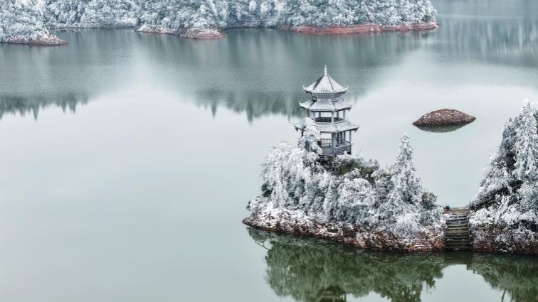 近日,雪后初霽,廣西三江侗族自治縣獨(dú)峒鎮(zhèn)大塘坳水庫(kù)美如仙境。無(wú)人機(jī)凌空俯瞰,云濤奔涌,雪覆千峰,茶園碧色半掩玉沙,水庫(kù)澄明如嵌琉璃,巨型風(fēng)車于冰霧間若隱若現(xiàn),冰雪、云海、碧水、茶園交織成一幅壯麗靈動(dòng)的詩(shī)意畫卷,宛如天上宮闕落人間。