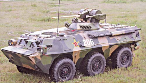 另外根據(jù)需要,它可以配置5.8毫米、7.62毫米、14.5毫米機(jī)槍或40毫米榴彈發(fā)射器。也可掛裝“紅箭”系列導(dǎo)彈。 該車車長(zhǎng)通過(guò)光電合一的觀察指揮鏡(或炮長(zhǎng)通過(guò)槍榴合一的綜合瞄準(zhǔn)鏡)搜索戰(zhàn)場(chǎng),發(fā)現(xiàn)目標(biāo)后超越調(diào)槍,使目標(biāo)出現(xiàn)在炮長(zhǎng)視場(chǎng)內(nèi):炮長(zhǎng)瞄準(zhǔn)目標(biāo)后,鐳射測(cè)距,武器伺服控制系統(tǒng)自動(dòng)解算和裝填射角。炮長(zhǎng)鏡內(nèi)有一套專有的2:1傳動(dòng)機(jī)構(gòu)。保證在大仰角的情況下使用榴彈發(fā)射器時(shí),目標(biāo)仍然保留在炮長(zhǎng)視場(chǎng)內(nèi)。炮長(zhǎng)可以在車內(nèi)實(shí)現(xiàn)武器開閂和射擊。槍榴合一的綜合炮長(zhǎng)瞄準(zhǔn)鏡高、平兩用,白光、微光、鐳射三光合一。緊急情況下,可以用應(yīng)急紅外探照燈增加夜間作戰(zhàn)距離。光電合一的車長(zhǎng)觀察指揮鏡由二代半的像增強(qiáng)器和CCD系統(tǒng)組合而成,車長(zhǎng)在微光情況下。也可以搜索、觀察:超大螢?zāi)坏牟噬@示器使車長(zhǎng)搜索、觀察時(shí),景物層次分明;車長(zhǎng)觀察指揮鏡具有鐳射測(cè)距的功能。煙幕彈可以使車輛在緊急情況下得到保護(hù)。