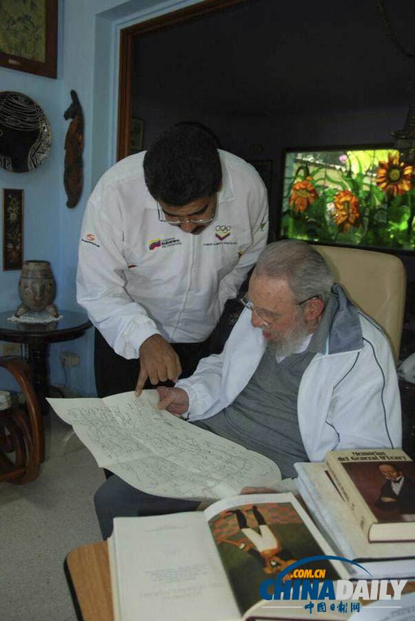 委內瑞拉總統(tǒng)馬杜羅去年12月21日通過推特公布一張與卡斯特羅的合影。圖片顯示,兩人在哈瓦那會晤時曾一起研究過一張地圖。(圖片來源:英國媒體)
