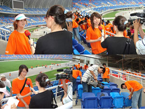 義務(wù)勞動(dòng)結(jié)束后,在體育館前廣場(chǎng),參加志愿服務(wù)天外學(xué)子做為高校學(xué)生代表參加了FIFA2007女足世界杯倒計(jì)時(shí)100天天津各界群眾慶?;顒?dòng),為女足加油、為奧運(yùn)助威。女足世界杯中國(guó)組委會(huì)副主任、天津賽區(qū)組委會(huì)主任孫海麟宣布慶祝活動(dòng)開始。儀式后進(jìn)行了“瀟灑綠茵場(chǎng),鏗鏘玫瑰情”大型文體表演,專業(yè)演員、運(yùn)動(dòng)員、志愿者同臺(tái)表演,現(xiàn)場(chǎng)成為歡樂(lè)的海洋。同時(shí),在原體育中心場(chǎng)館內(nèi)舉行了國(guó)際劍聯(lián)女子佩劍世界杯大獎(jiǎng)賽天津站的國(guó)際比賽。英語(yǔ)學(xué)院的志愿者們?cè)趫?chǎng)內(nèi)為學(xué)院的譚雪同學(xué)加油助威。最終譚雪同學(xué)勇奪個(gè)人冠軍,中國(guó)隊(duì)獲得大獎(jiǎng)賽天津站的團(tuán)體冠軍。