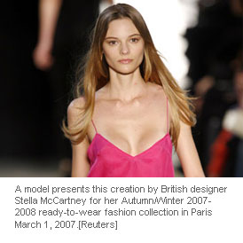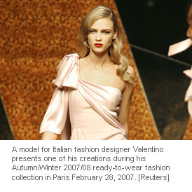 A model for Italian fashion designer Valentino presents one of his creations during his Autumn/Winter 2007/08 ready-to-wear fashion collection in Paris February 28, 2007. [Reuters]