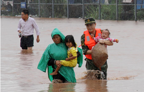 Typhoon Son-Tinh has brought strong wind and downpours to Guangxi since Sunday, sinking six boats and causing another 70 to go missing on a China-Vietnam border river.